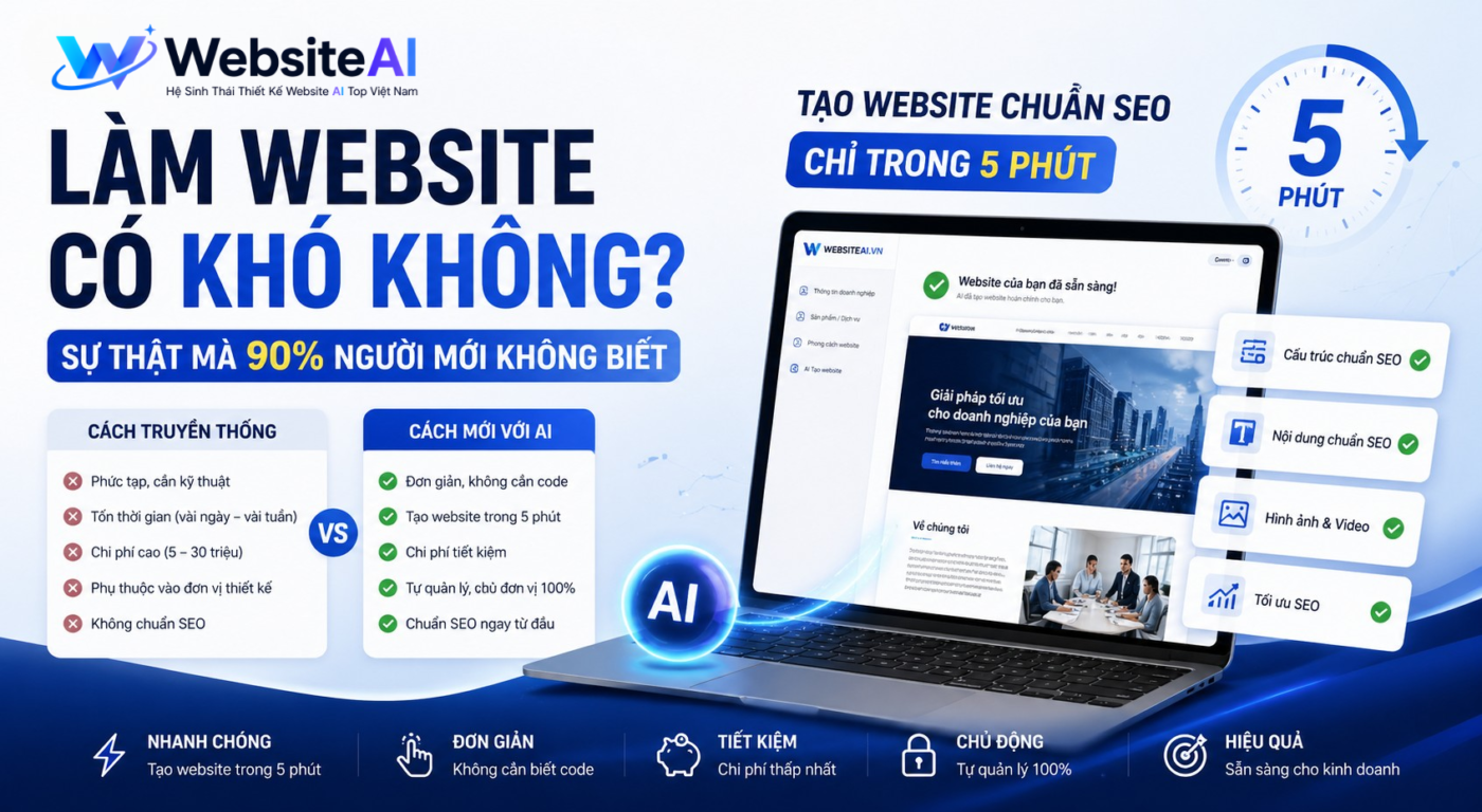 Làm website không khó nếu bạn chọn đúng công cụ. Với AI, bạn có thể tạo website nhanh, đơn giản và hiệu quả.