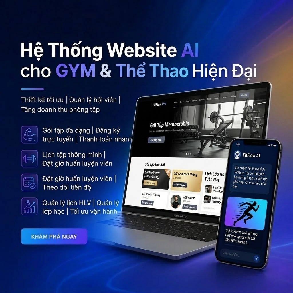 Là giải pháp xây dựng website thông minh tích hợp trí tuệ nhân tạo, giúp phòng gym, trung tâm thể thao và huấn luyện viên cá nhân tối ưu vận hành, nâng cao trải nghiệm hội viên và gia tăng doanh thu. Hệ thống hỗ trợ tự động hóa quy trình đăng ký, đặt lịch tập và triển khai marketing hiệu quả trên nền tảng số.