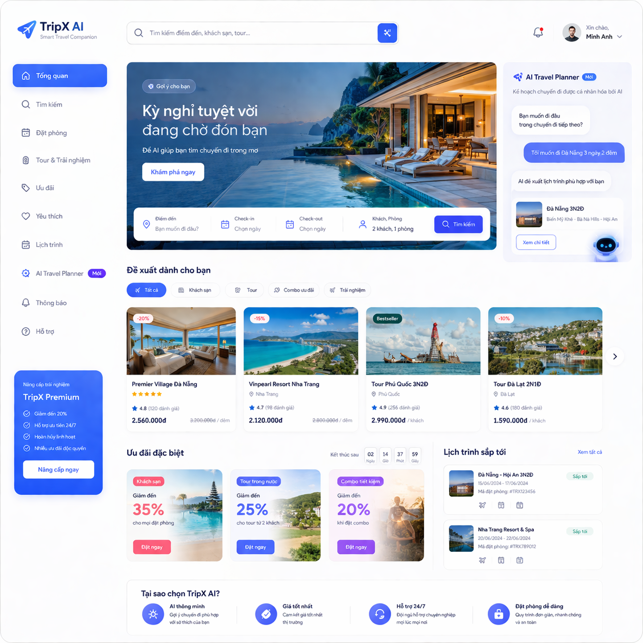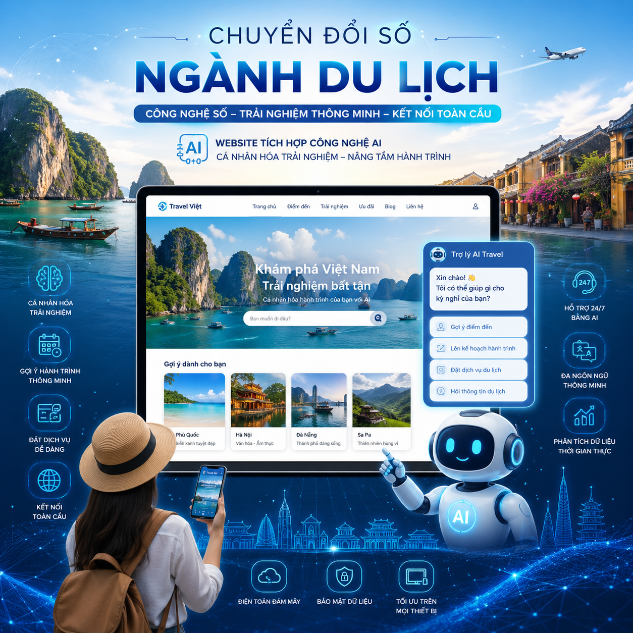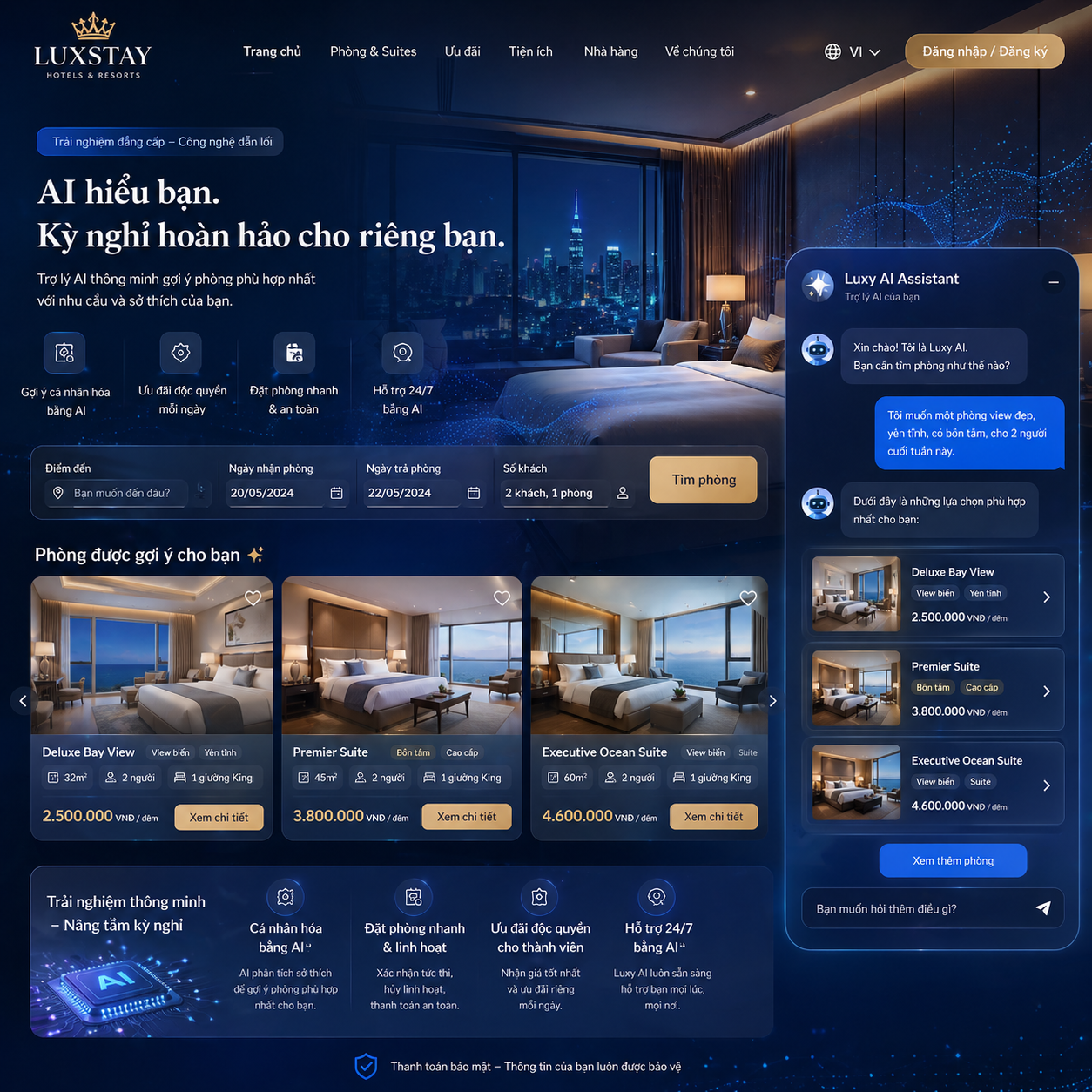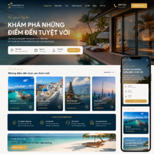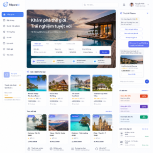 Website AI cho ngành khách sạn & du lịch giúp việc đặt phòng và tư vấn khách hàng trở nên đơn giản hơn. Giao diện đẹp, sang trọng, phù hợp với ngành dịch vụ.