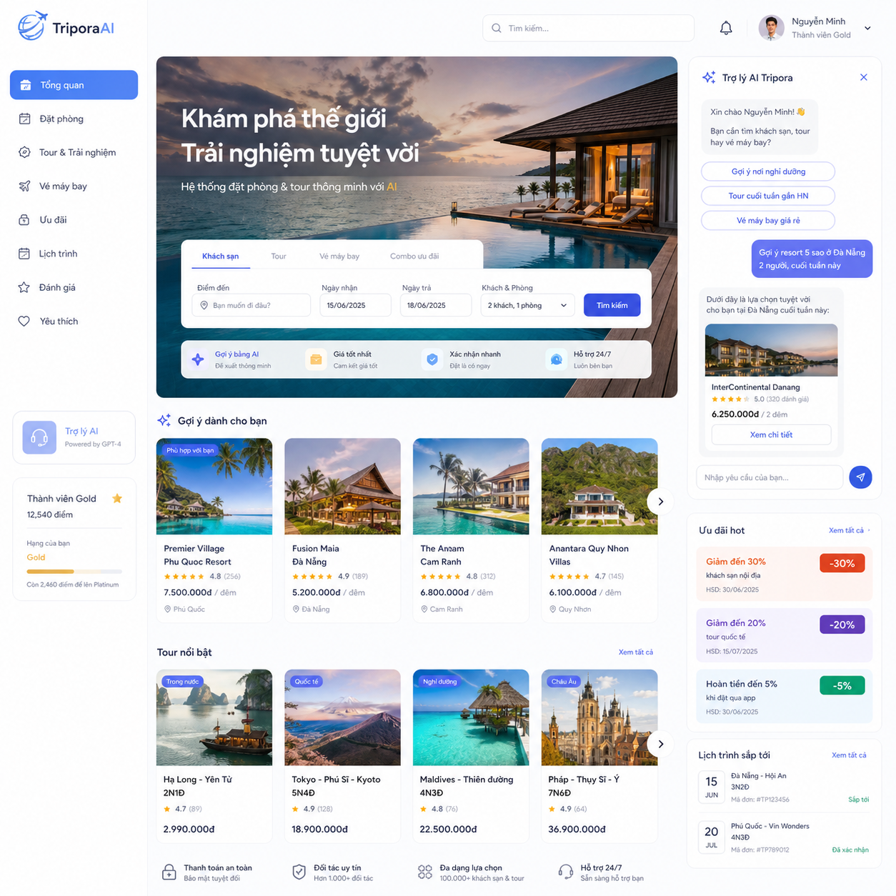 - Tích hợp AI hỗ trợ tư vấn phòng và tour du lịch tự động